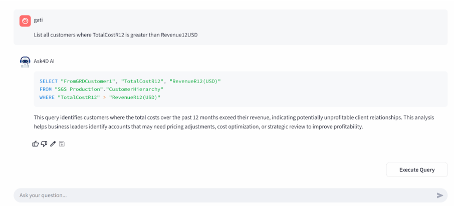 1. Simplified Data Access: Ask4D democratizes data access by allowing users to retrieve insights without requiring technical expertise. This approach reduces the dependency on specialized skills and accelerates decision-making processes.