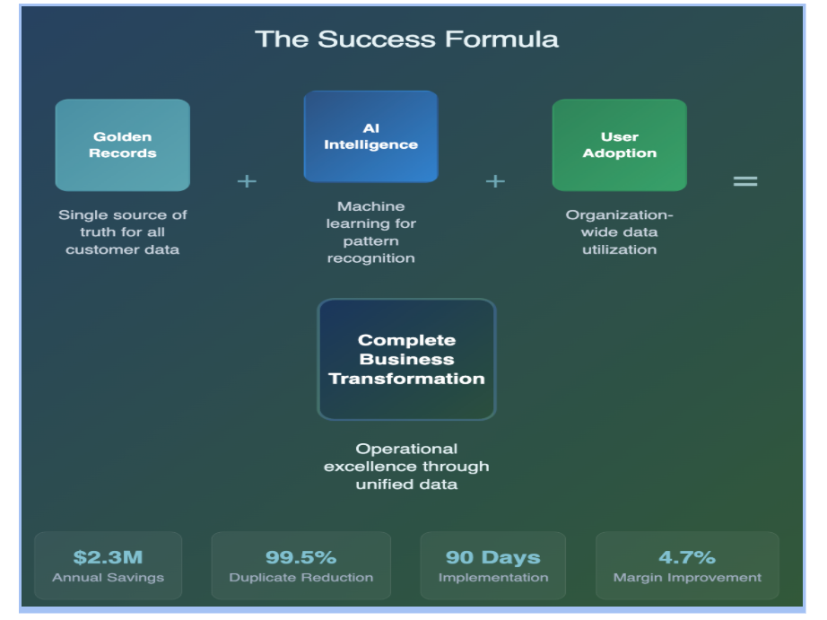 While there are countless cases of missed opportunities, one example stands out. A customer was recorded as ABC Corporation in one system and A.B.C. Corp in another. Because the records were never unified, the company failed to recognize that this client was already spending $3 million annually with the services division. When a regional account manager closed a $500,000 deal, the chance to bundle a $1 million-per-year maintenance contract was lost. The absence of a Golden Record meant fragmented visibility — and millions in revenue left on the table.