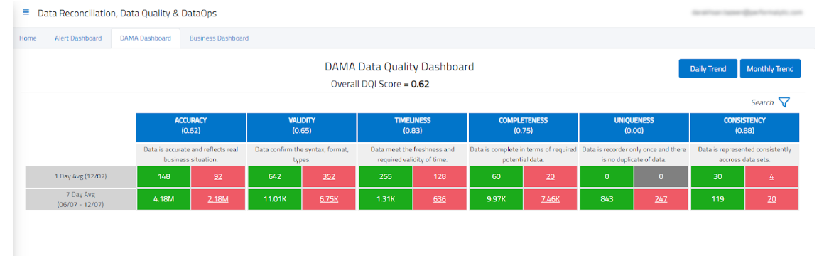 Modern data quality management goes beyond just detecting errors—it empowers businesses with actionable insights. With 4DAlert, organizations generate real-time data quality scores, providing complete visibility into their overall data health. These insights help data engineers, business teams, and decision-makers quickly pinpoint problem areas and take corrective action before issues escalate.